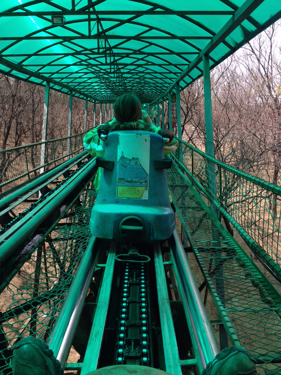 The terrain at Badaling is very hilly, and the elevation change between the parking area and the Wall is pretty extreme. You can walk up to the Wall, but it is a steep climb. You can be whisked to the top in a cable car. Or, you can ride on pulley cars, which are sort-of toboggans that run along a rickety track. The pulley cars reminded me of the county fair where I grew up. The ride is thrilling at least partly because you are not sure you will make it to the end in one piece!
